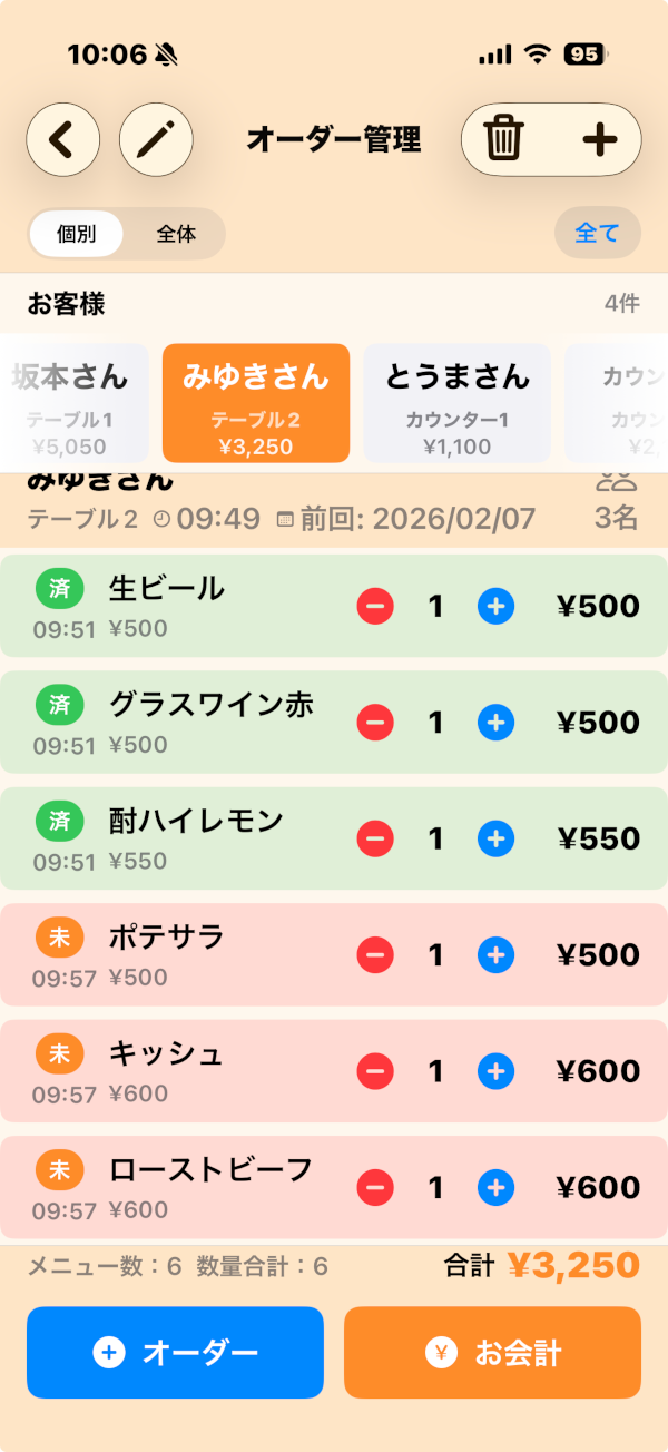 お客様ごとにオーダーを管理し、提供状況もリアルタイムで把握。