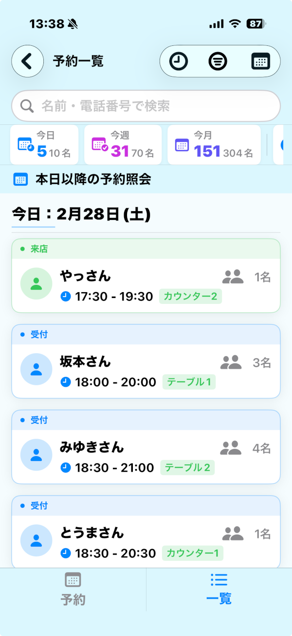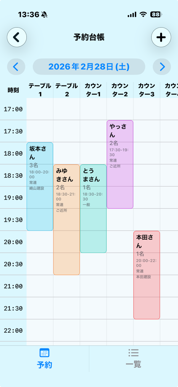 テーブルやカウンターごとに予約をタイムテーブルで一目で把握。