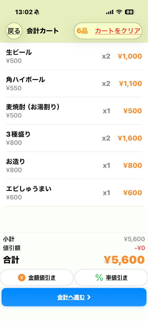 オーダー内容がそのまま会計に反映。金額値引き・率値引きにも対応。