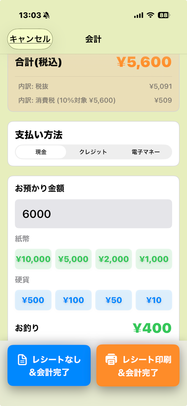 現金・クレジット・電子マネーの支払い方法を選んで、お釣りも自動計算します。