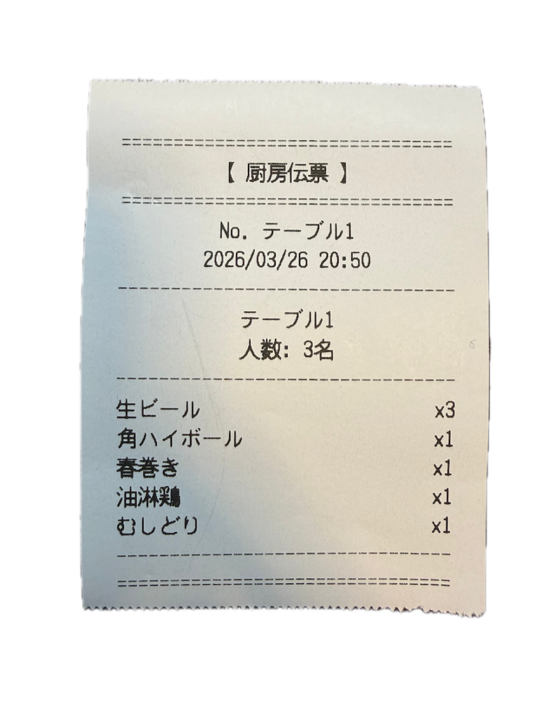 お店の相棒で注文を登録すると、レシートプリンターでオーダー(注文)伝票を印刷する機能を開発中です。