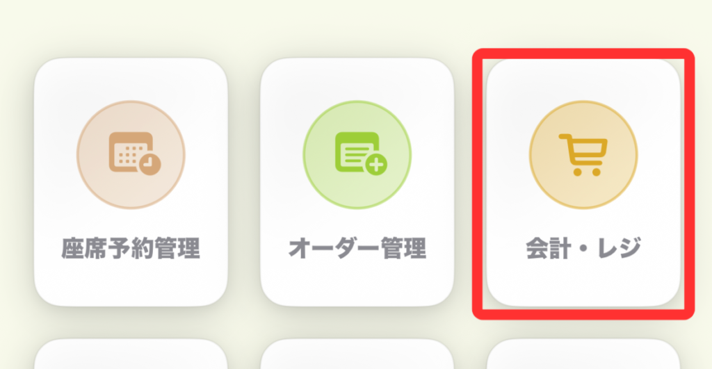 この場合、使用するホーム画面のメニューは[会計・レジ] 。