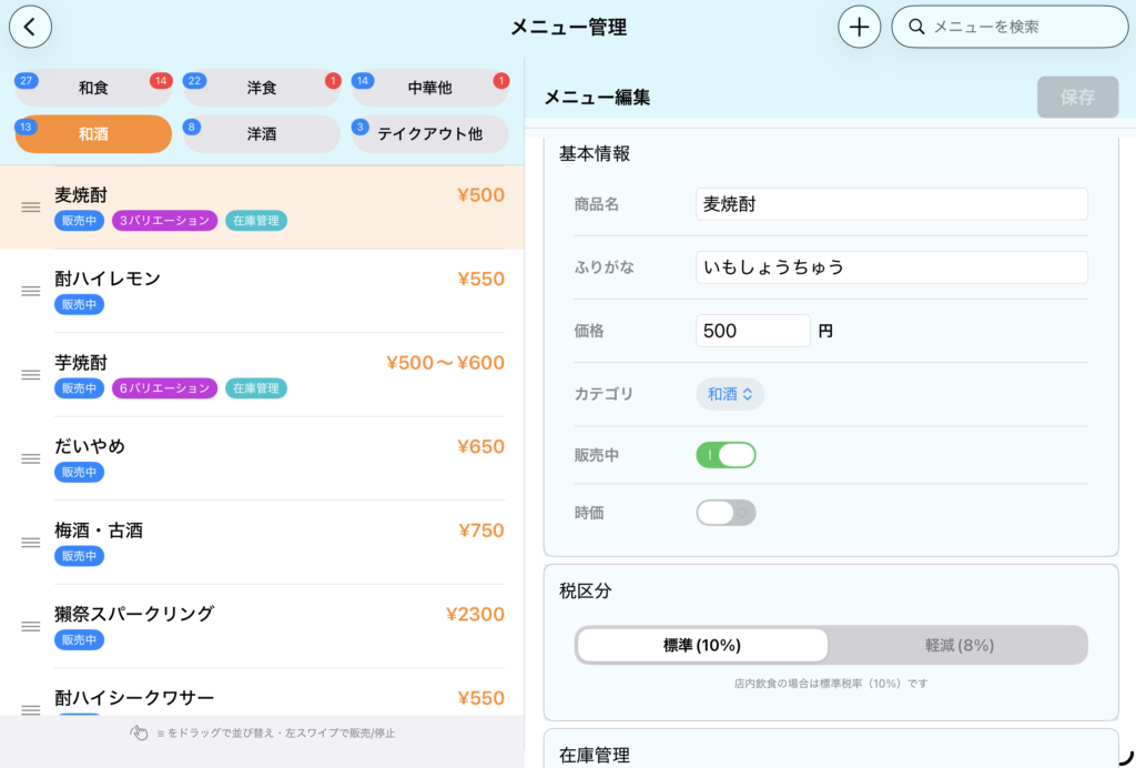 - 時価(価格変動): 日によって価格が変わるメニューの場合は、スイッチを ON にします。これにより、注文ごとにお会計画面で価格を入力できるようになります。
