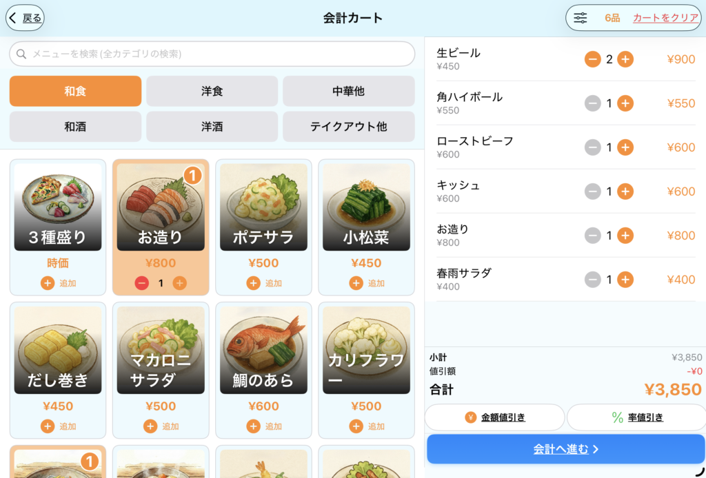 メニュー選択でメニューをタップすると、右側の会計カートに追加されます。