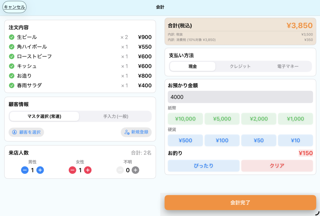 3. 精算: お預かり金額を入力し、「会計完了」をタップして終了です。