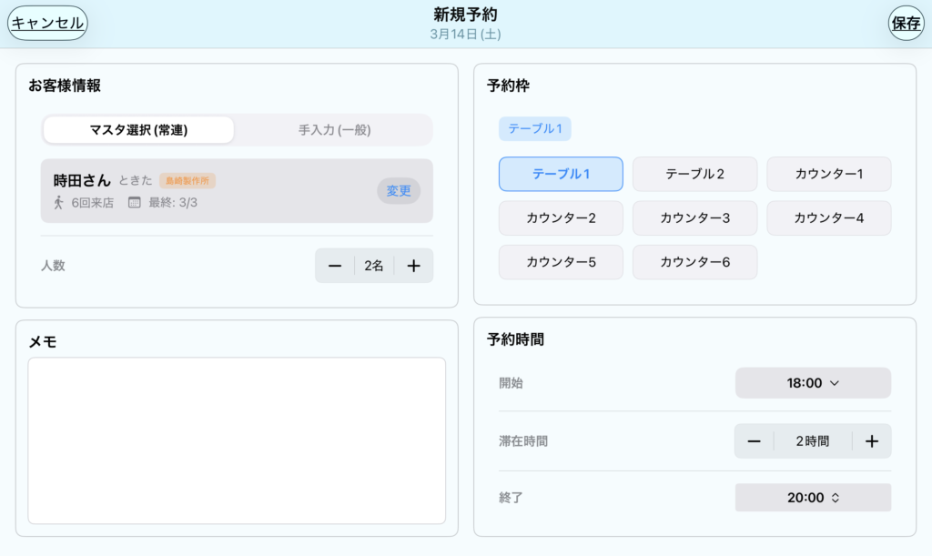 電話や店頭で受けた予約を登録します。スケジュール画面の空き枠をタップすると、座席と時間が指定された状態でこの画面が開きます。