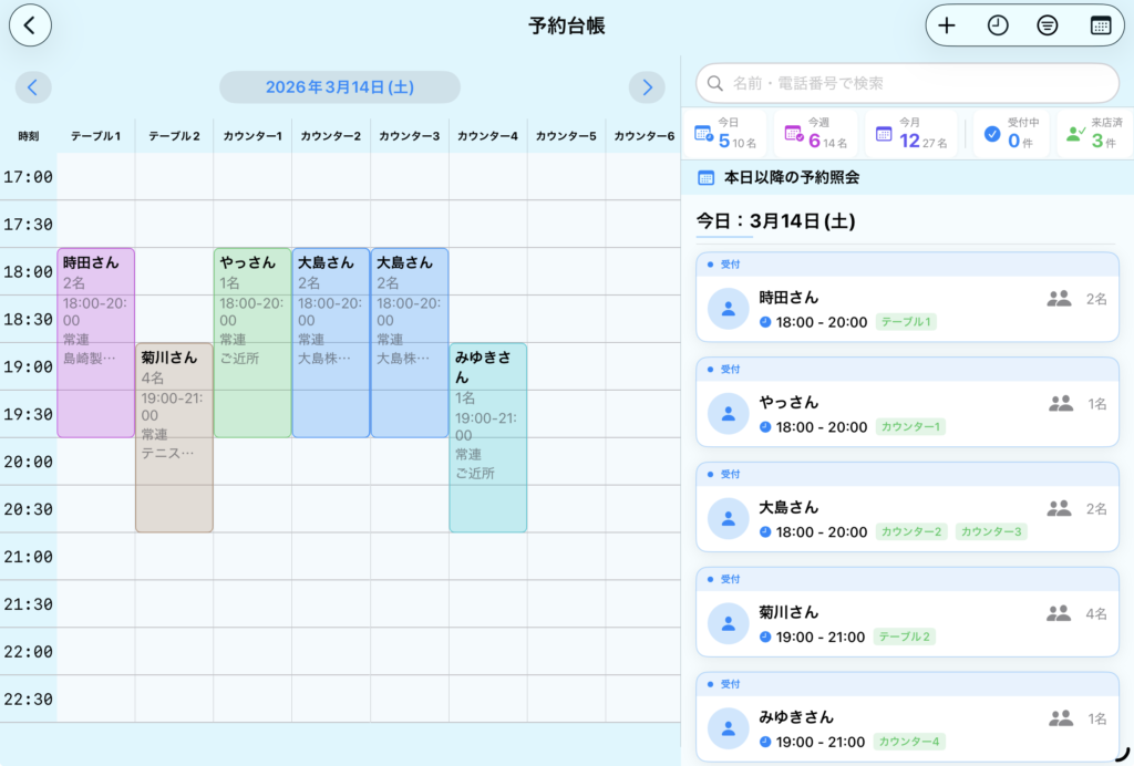 - 集計チップ(検索窓の下): 「今日」「今週」「今月」の予約件数と合計人数を自動集計して表示します。